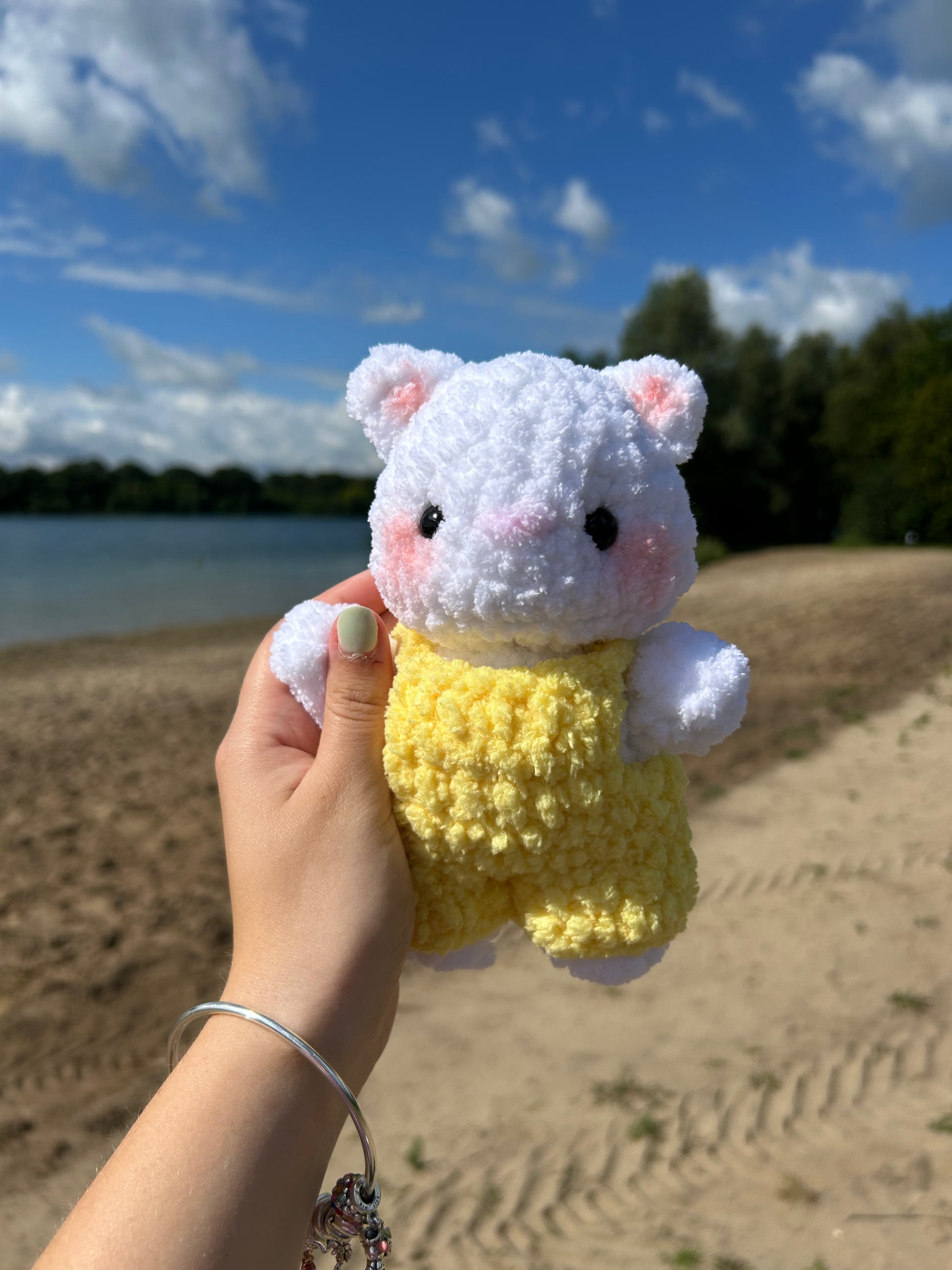 This white Sylvanian Families Cat wears a cheerful yellow overall and has soft pink blush and ears. Standing at 20 cm, it’s the perfect handmade companion for fans of the series or anyone who loves sweet and simple plushies.