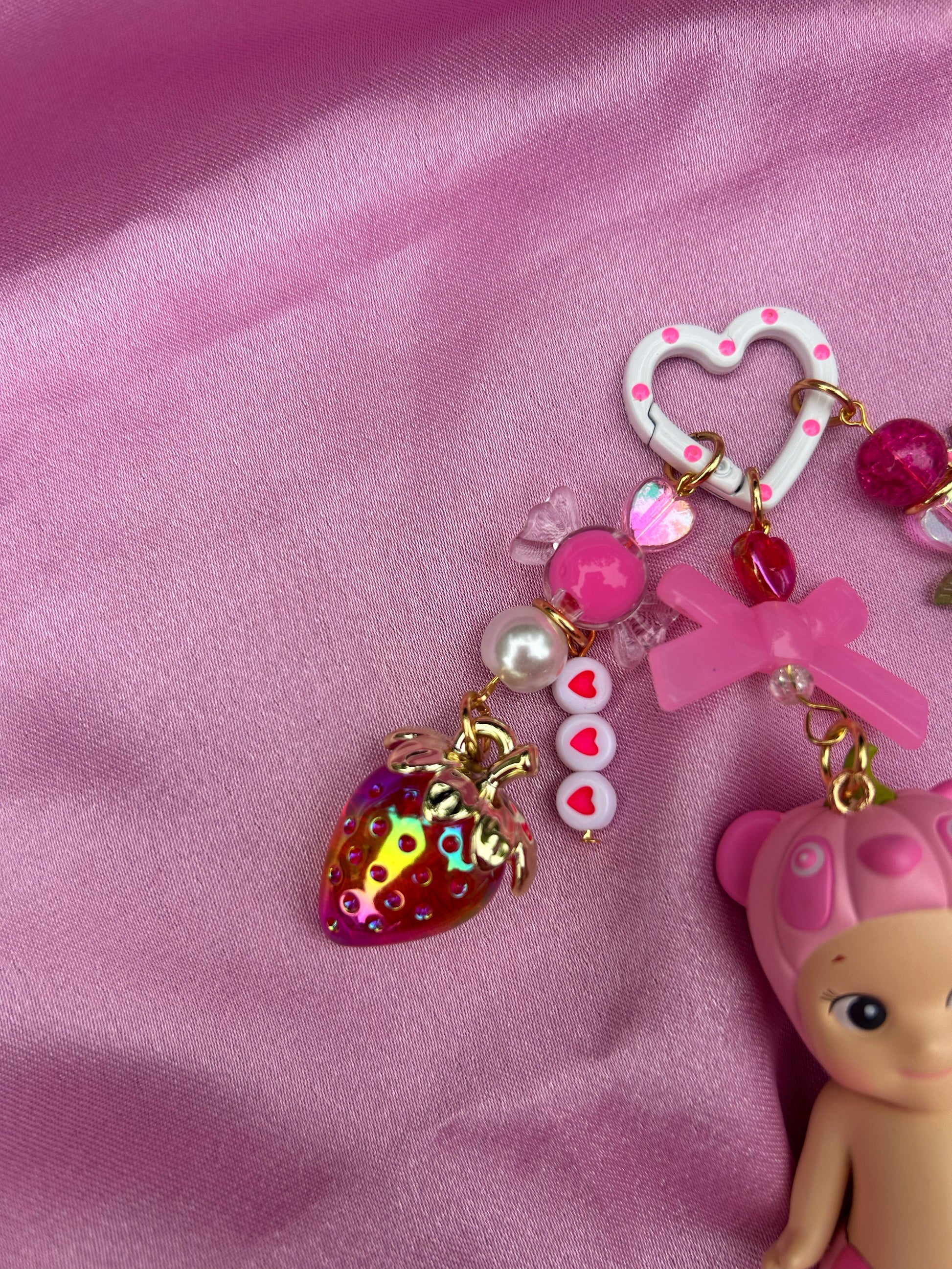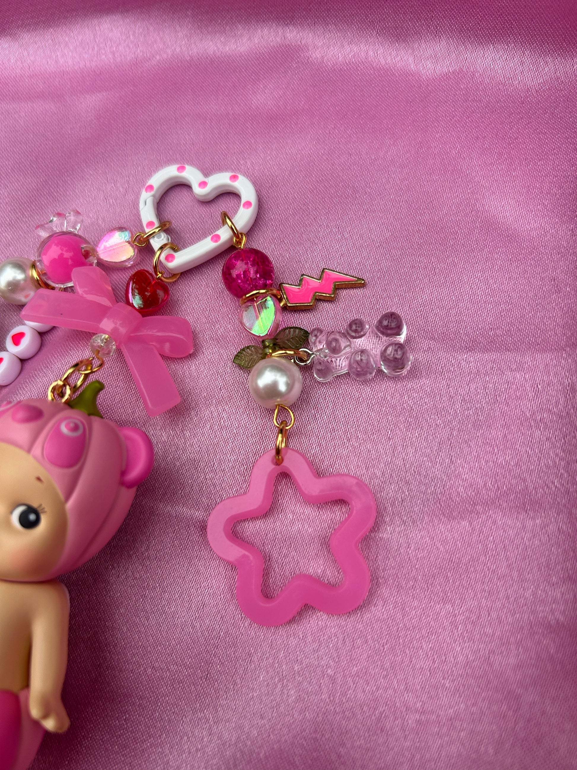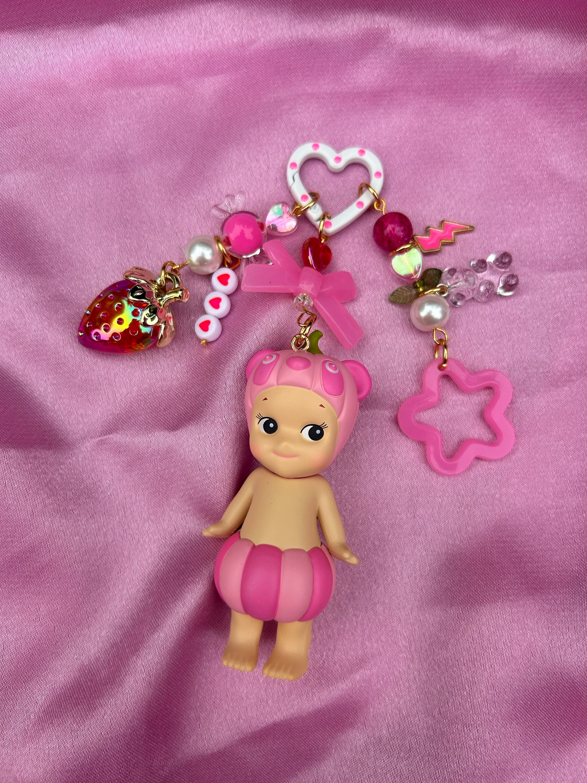Say hello to the adorable Pink Panda Pumpkin Sonny Angel Keychain. Dressed in a soft pink pumpkin panda outfit, this little cutie radiates sweetness and charm. He hangs from a white heart shaped keychain with pink dots, decorated with pink beads and charms such as a pink strawberry, heart shaped beads, a pink candy, a pink star, a transparent candy bear, and a pink lightning bolt, all surrounded by shimmering pearls and sparkling beads. Sweet, soft, and full of playful energy, this is a 100% original Sonny Angel.