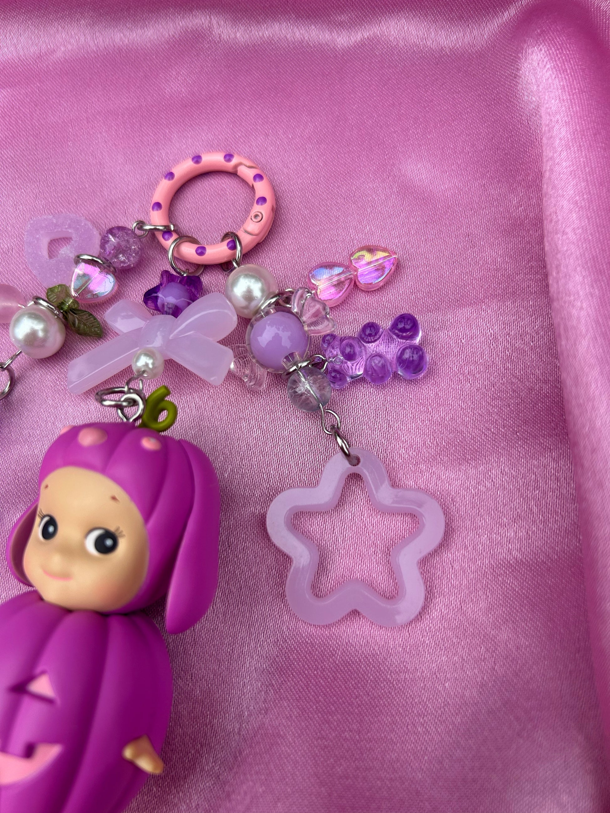 Say hello to the magical Purple Pumpkin Bunny Sonny Angel Keychain. Dressed in a soft purple pumpkin bunny outfit, this little cutie brings a touch of whimsy and Halloween charm wherever he hops. He hangs from a pink keychain with purple dots, decorated with a purple balloon dog, a few candies, pink hearts, and a purple star, surrounded by shimmering beads and pearls. Sweet, dreamy, and full of playful spirit, this is a 100% original Sonny Angel.